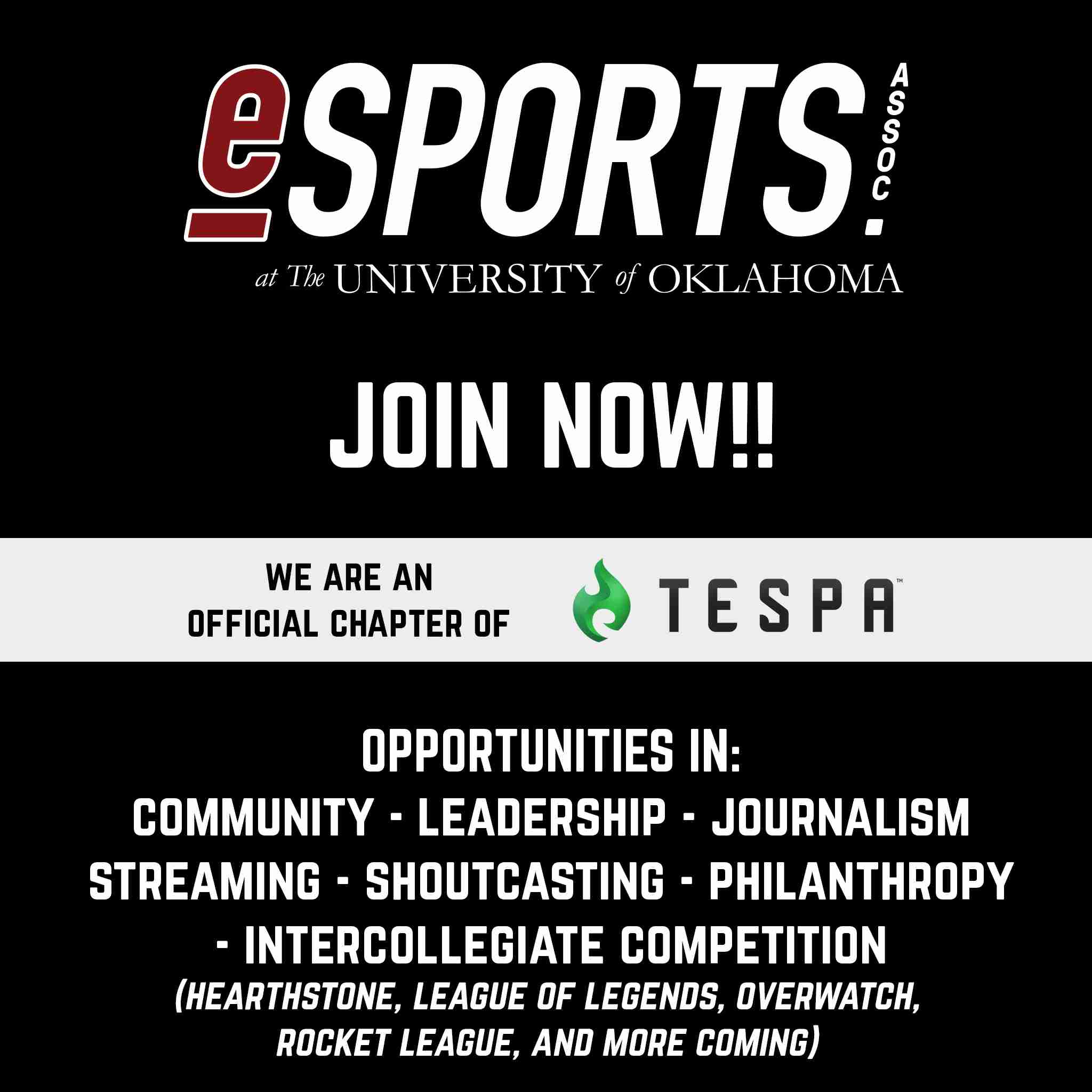 This specific event is to help start breaking the ice on who we are and what esports is. Kris Davis, Vendor Relations Advisor, will highlight the purpose of the ONE U store on campus and how it supports the Esports Association and growth in our topic. Mike Aguilar, Lead Advisor, will then briefly discuss the opportunities esports at OU brings to the table and provide a macro view on this wildfire topic specifically in the collegiate space. This event invites parents to attend as well and they both will welcome questions, discussion, and insight to our topics.