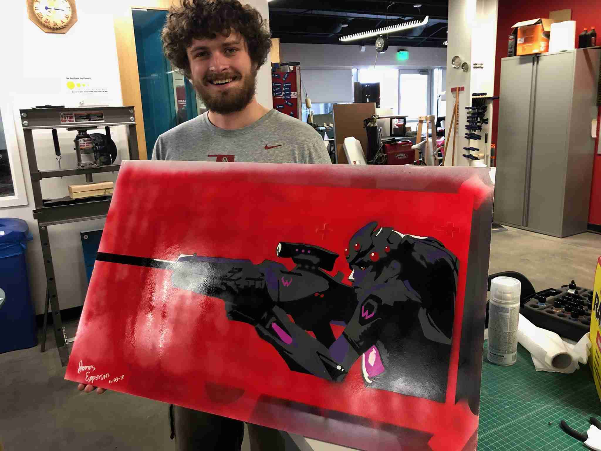 Artist JD holding his freshly painted Widowmaker. He has donated this painting to help raise funds for Extra Life using his own unique talents. GET BIDDING!
