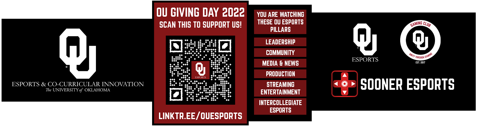 On April 14, 2022 The University of Oklahoma will launch it’s annual philanthropic day of giving aimed at supporting our programming across the entire surface of OU. This year the department of Esports & Co-Curricular Innovation which encompasses several various brands, hosts a community of over 2,700 members, has over 160 students in 6 different pillars of development, and awards scholarships focused on path to industry will host a 24 hour live stream from 11:45PM on April 13, 2022 to 12:15AM on April 14th. This article will serve as your TV Guide to our day of programming.
